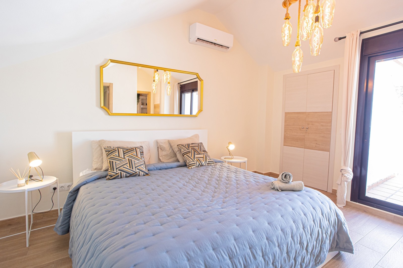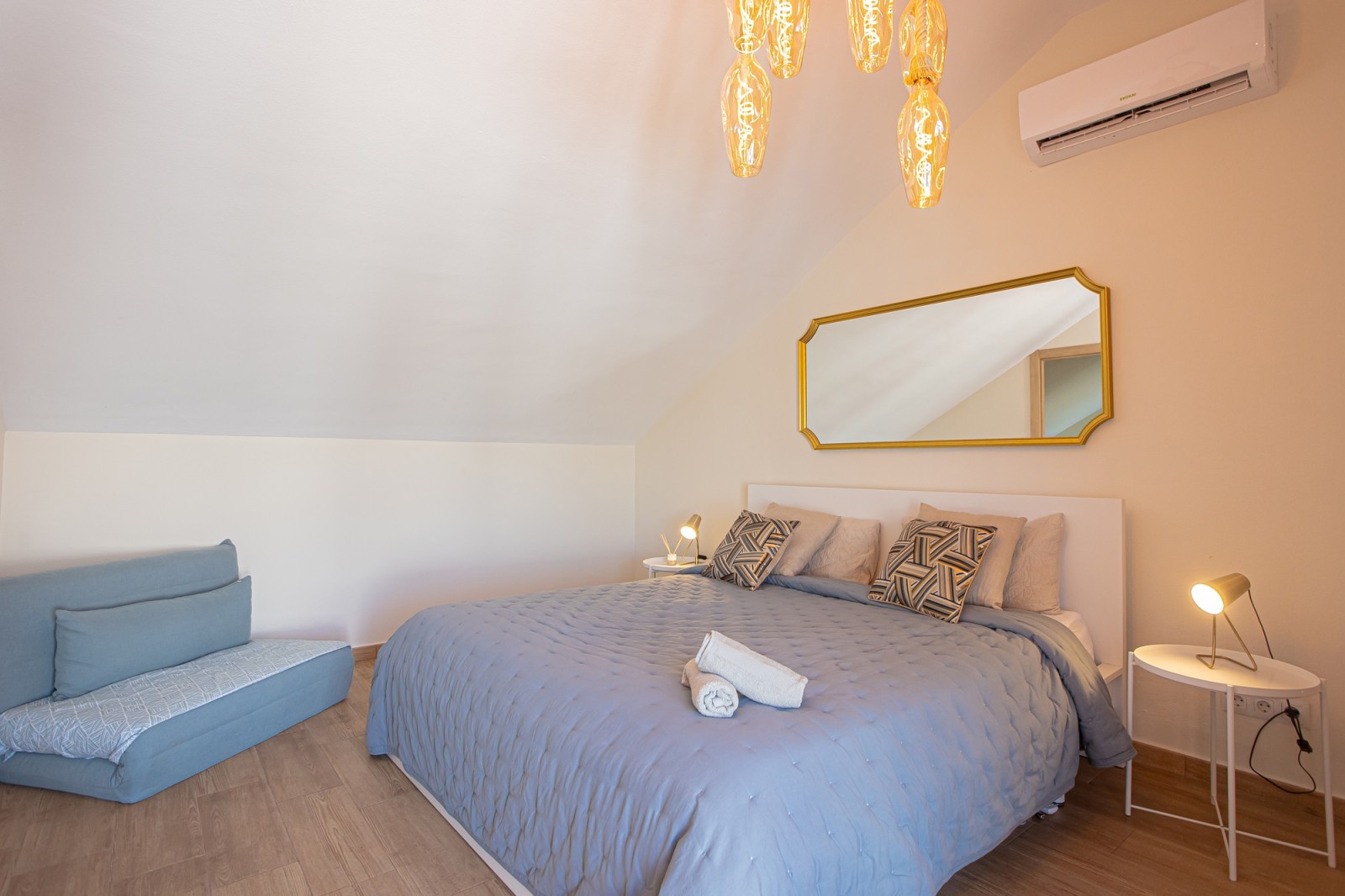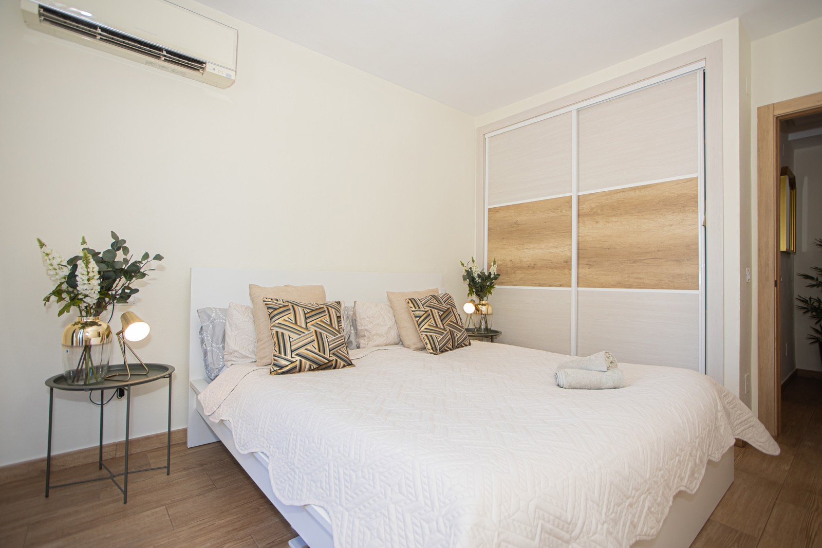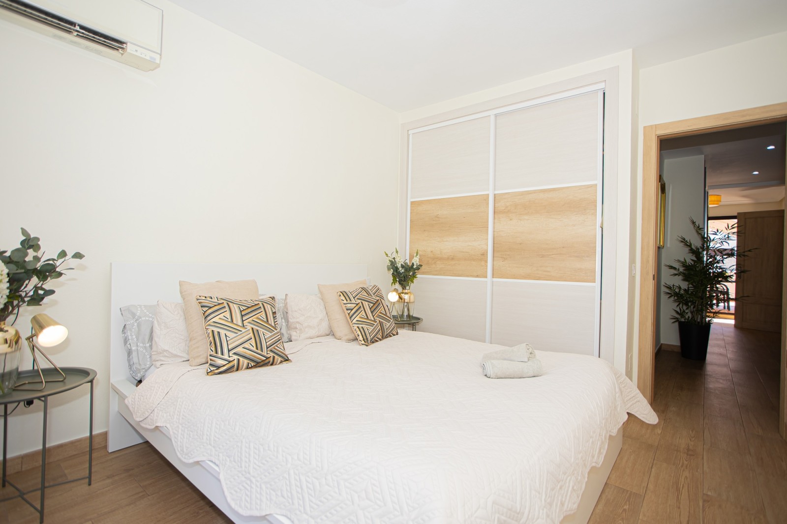 The upper level of the penthouse is dedicated to the master bedroom, which features a lovely walk-in closet and a private terrace with enough space for sun loungers. The master bedroom terrace also includes additional storage space and a parking area.